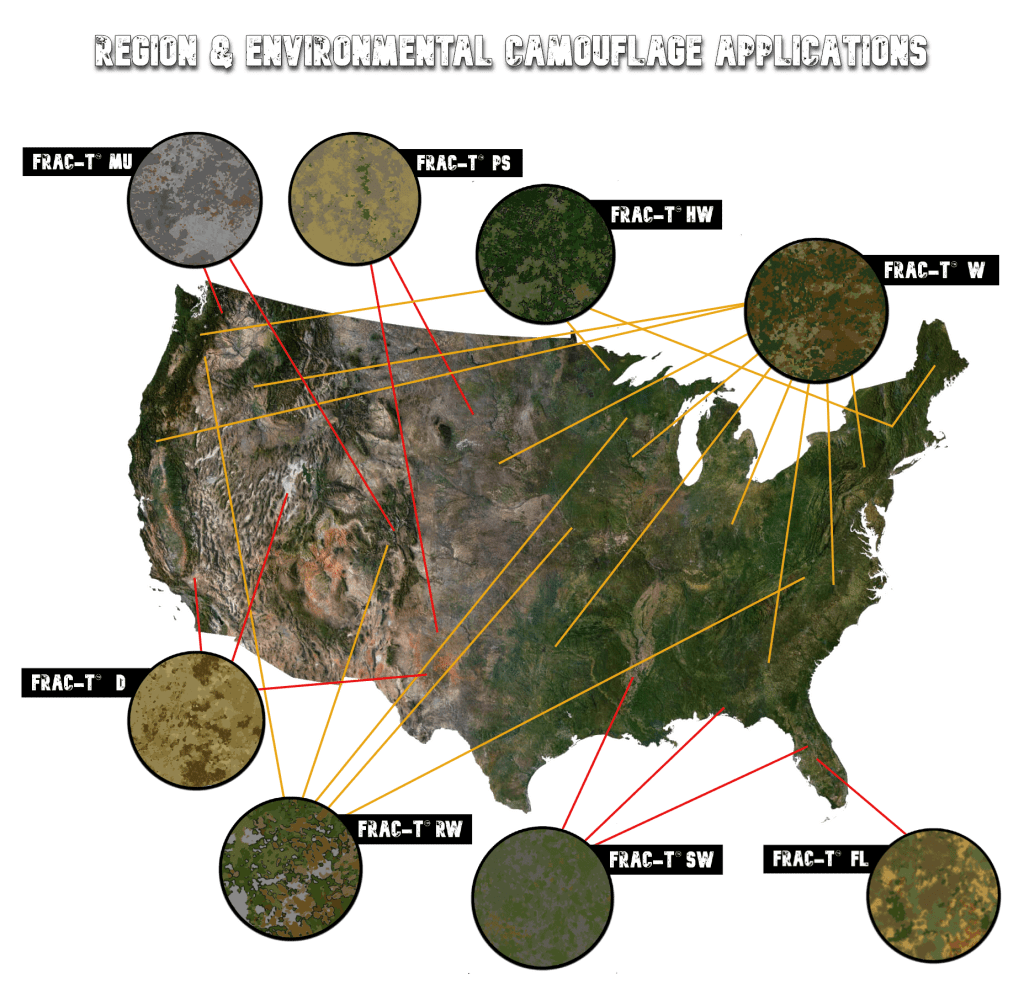 FRAC-T™ Fractal-Spectral Camouflage Systems are designed by DJ, a US Army Veteran, Private Sector Security Professional, and Graphic Designer. He sought to create a series of regionally and seasonally applicable camouflage patterns that better promoted compatibility and blending elements of nature alongside finding both himself and his peers/ associates discussing a need for more options of highly effective camouflage to use in a variety of applications. He spent several years studying the dynamics of camouflage effectiveness alongside environmental analysis, all on top of his 20+ years of experience using various patterns in the field. Using his design skills, he has developed an initial line of superior performing camouflages.